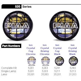 The PIAA 520 Series Ion Crystal Fog Lamp provides 95 degrees of lighting coverage and penetrates rain, fog, dust, and snow without bouncing back into the driver's eyes or offending oncoming traffic. Built with round, black stamped steel housing, glass lens, 12V-H3 85 watt bulb, and protective black grid style covers, these lights bolt easily onto your vehicle's grille guards or light bars with easy plug-in installation. This complete kit includes two lamps, pre-assembled wiring harness, relay, switch, and two black grid style covers and is backed by a limited warranty (bulbs excluded from warranty).