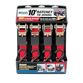 This 4-pack of Highland red ratchet tie downs are 10' by 1" and have coated S-Hooks to prevent scratching and are great for hauling motorcycles and other items in your vehicle. Made from Power Webb Plus with features like, triple layer webbing, WebGuard coating and flexible edge construction. Easy to use tie downs, just attach and pump the handle with the ratchet and it will tighten down your cargo with vise-like gripping power.