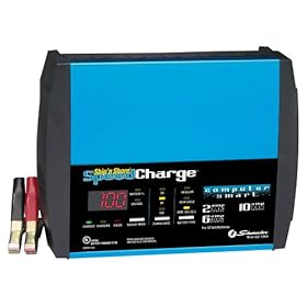 This automatic speed battery charger has a 10-amp fast charge self-adjustment feature which monitors battery condition and adjusts charge rate to prevent battery damage to your car, truck marine and farm equipment, gel cell, and deep-cycle batteries. The 2-amp slow charge helps in charging small batteries and maintaining large ones for motorcycles, snowmobiles, and lawn tractor batteries. It has an easy to read digital meter which displays battery charge status and test results. It weighs 6-lbs and has a retractable handle for easier portability. It is also provided with self-stored cables, system testing capabilities, and electronic push button controls. This item requires special handling for deliveries outside the contiguous US.