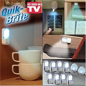 Quik Brite LED Lights- Set of 8 with Bonus Swivel Spots Quik Brite automatically turns on when you open any drawer or cabinet - off when you close! No installation, just peel and place! Perfect for drawers, cabinets, closets, medicine cabinets, fuse boxes, tool boxes, anywhere you need light. Quik and easy installation No nails, screws or bolts are needed to install Quik-Brites. Just peel and place for fast and easy installation. BONUS: 2 Swivel Spots- With your order today you will also receive 2 tap-on SwivelSpots. They go from mini floodlights to mini spotlights instantly, swiveling around a full 360 degrees! Perfect for lighting under cabinets or in decorative curio displays.