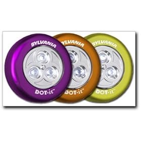 3-pack Assortment: one each Purple, Orange and Lime Green Where Do You Need Light? Sylvania DOT-it Bright White LED Light is bright, white and long-lasting. Better than those big dim incandescent tap lights and easier to use than a flashlight. Its convenient: sticks to most anything, including fabric, leather, plastic and glass - without marring the surface. Its is self-adhesive. Jush push to turn on and off. Bright white LED light with self-adhesive back for temporary No Mar stickup anywhere you need illumination. Sticks practically anywhere you have a clean solid surface. Colored housing presents a complementary finish to wherever you choose to mount the lamp. Powered by three AAA batteries that are included. Features: - Replace batteries every 100 hours for maximum brightness - Portable - no wires - use it anywhere - A unique 3M adhesive on every DOT It light sticks and re-sticks to practically any surface, without marring. The adhesive can withstand extreme temperatures from zero to 120 degrees and can be used over and over again - Small enough to fit in your pocket and can stick to a variety of surfaces, including fabric, leather, plastic, glass and fiberglass. Use them anywhere you need light: in your car, in your home, where you play, where you work or with your kids